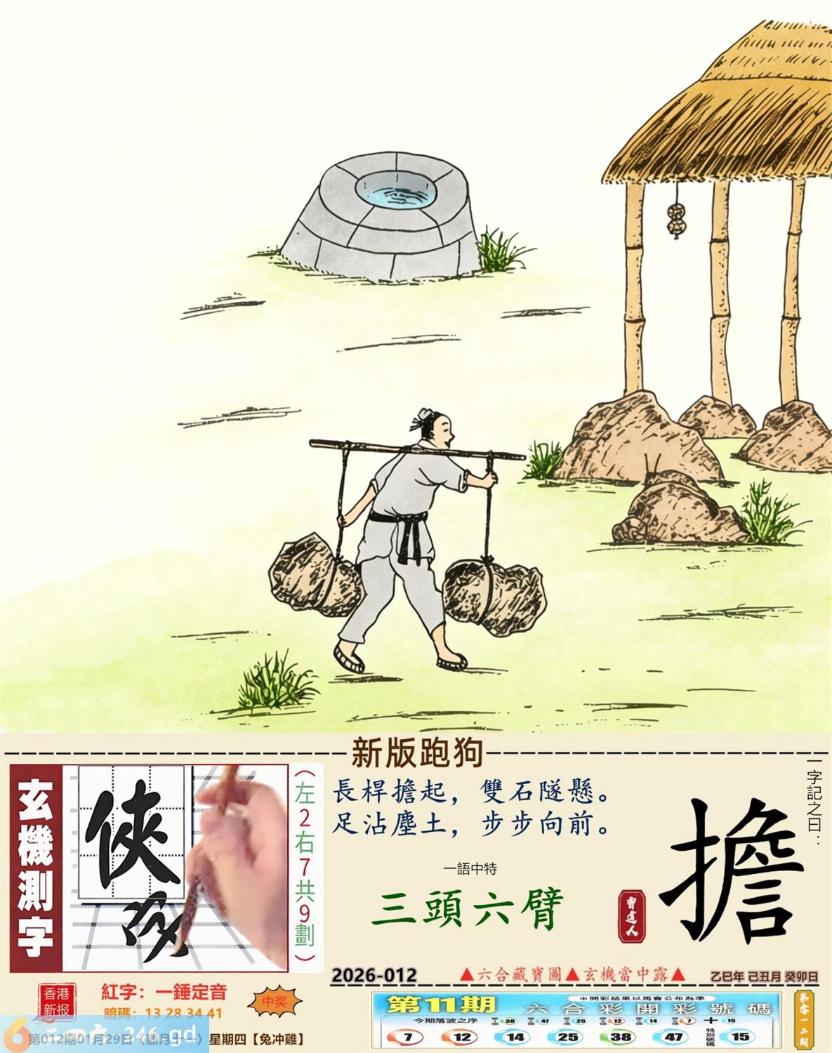 本帖最后由小歪于2026-1-2908:41编辑 2026年1月29日012期鸡(丁酉)(金箔金) 012期:老版跑狗玄機一字記之曰:【高】 詩云:下定決心闖一闖唯怕高處不勝寒 人望高處,勇氣難檔,下定決心闖一闖; 登峰造極,何其風光,唯怕高處不勝寒。 玄機測字:《娃》 密圖詩:竹藍打水一場空 《記》:八仙賀喜到門前 特碼大小單雙句:天天去市場買菜 今期必中:馬超 012期:特碼歇后語 祖奶奶的花鞋-----老式样 012期正版四字梅花诗:三天打鱼。 012期火车头:烧伤马。诗:马死兔伤,二九出特今期来。 012期香港第一手欲钱料:日本? 012期曾道人说:“三个?” 012期另版四字梅花诗:美丽神话。 012期香港第一手欲钱料:欲钱找2005年最后一期的开奖记录。 012期曾道人说:“恭贺大陆各位彩民在2005年的最后一期发大财”? 012期:二字經:多情 012期:二流子是特码 012期:智力金壤;左道旁门 012期:信箱紅字:【一錘定音】 012期:【暗碼:13-28-34-41】 012期:一語中特:【三頭六臂】 發財玄機圖:聞嗅探索警覺性強圖中明鼠紅藍 012期:藏寳圖 新:家在画桥堤下住 老:古来惟有酒偏香 禁:猴禁:9尾玄機字《读》 2026年012期【生活幽默】版 〖一個專養乳牛的牧場〗 一個專養乳牛的牧場,爲了維持牧場内牛衹的数量,在母牛群中放養了一衹公的乳牛。但是時間久了,這衹公牛也老了,開始有點力不從心,于是牧場的主人又買了一衹新的公牛來擔任維持牛衹數量的工作。至于那衹老公牛,由于過去数年來,它没有功勞也有苦勞,所以主人還是繼續放它在母牛群裹逍遥。有一天,主人去巡視牧場,看見老公牛氣喘嘘地趴在草地上。牧場主人走近説:你年紀大了就收斂一點,不要作這多。老公牛一臉無辜的説:你難道不能告訴那衹新來的,我不是母牛!